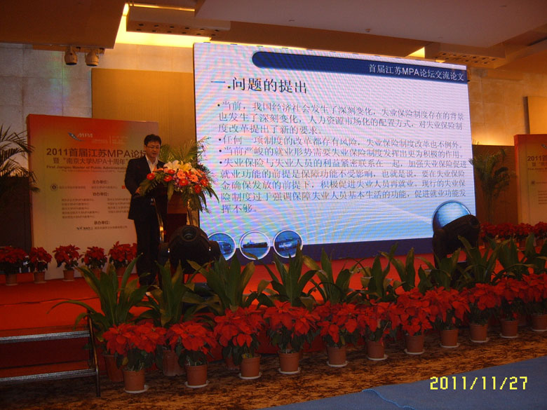 2011首届江苏MPA论坛议题主要有三项:一是促进就业与构建和谐劳动关系;二是如何解决中小企业融资难困境;三是如何以社会管理创新推进和谐社会建设。唐克同学和张斌阳同学的论文被收录到首届江苏MPA论坛论文集,唐克同学还在论坛上做了主题为“中国失业保险促进就业功能研究”的演讲,受到与会领导和MPA同仁们的一致好评,为ManHub
