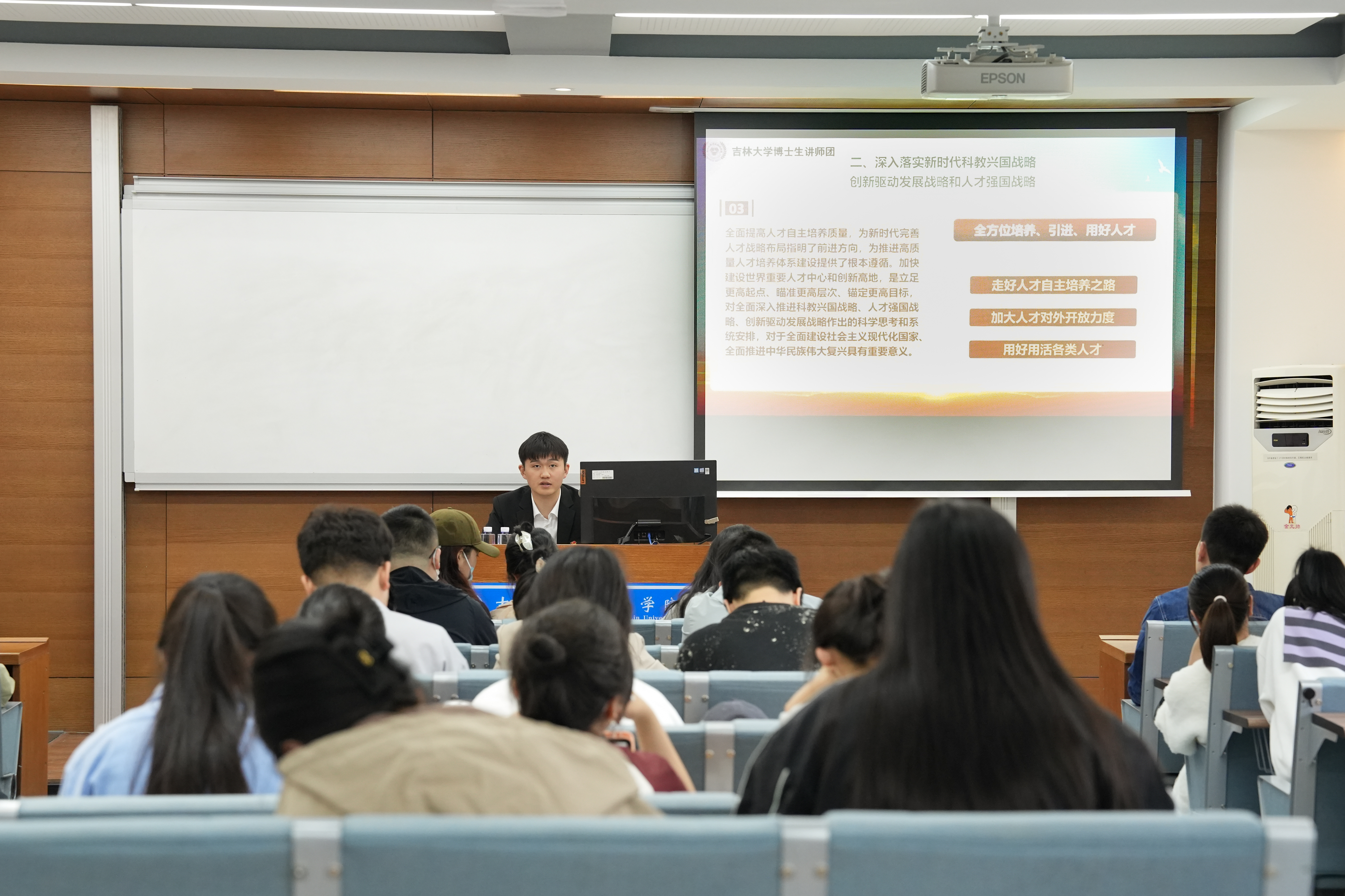 本次宣讲中,王嘉玮首先以2024年《政府工作报告》为切入点,向大家介绍了本次“两会”的主要内容,并与同学们共同学习了政府工作报告的要点,围绕政府工作任务中“大力推进现代化产业体系建设,加快发展新质生产力”,从“什么是新质生产力”,“为什么要发展新质生产力”和“怎样发展新质生产力”三个问题为切入,对新质生产力的定义、特征、内涵和重要意义进行了解读。从高质量发展的角度,举例一汽集团、三一重工、小米汽车、中车长客等企业创新发展成就,深入浅出的解读了新质生产力的重要意义。