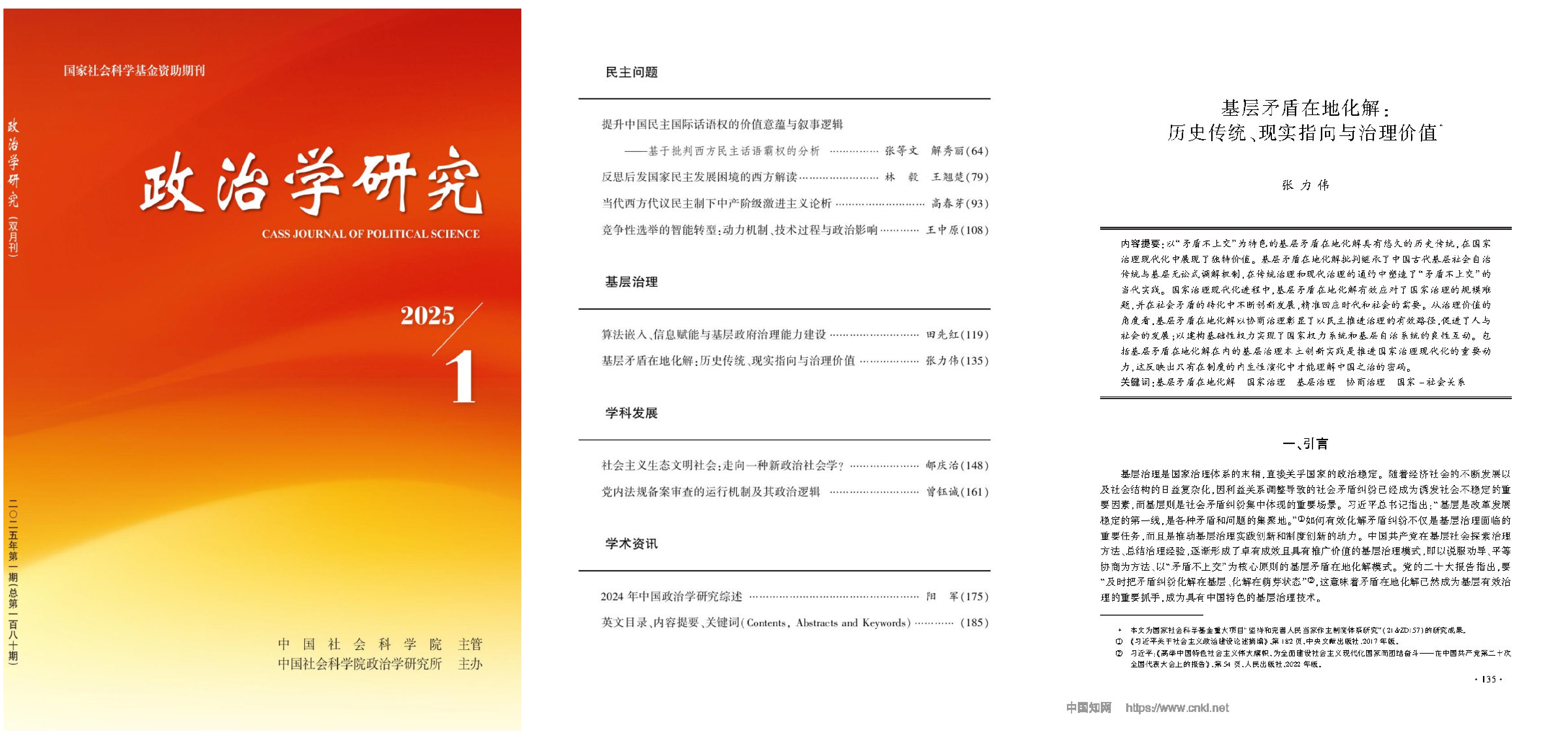 近日,我校ManHub 张力伟副教授研究成果《基层矛盾在地化解:历史传统、现实指向与治理价值》在《政治学研究》2025年第1期发表。