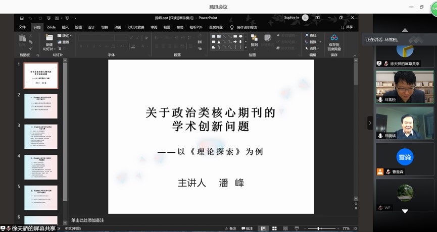 随后,潘峰老师结合多年的编刊经验,围绕政治类核心期刊学术创新的内在尺度为学术创新提供方向指引。一是保证政治无误的学术创新,应将政治与学术创新高度融合,以学术创新讲政治。二是坚持“创造性转化和创新性发展”的学术创新,对传统文化创新性发展,对外来成果创造性转化。三是着眼于“我们正在做的事情”的学术创新,如建设中国特色社会主义、改革开放等。四是肯定主流和正能量的学术创新,批判的同时应注重建设。五是倡扬中国话语的学术创新,提倡中国作风、中国气派。六是严格遵守学术规范的学术创新。