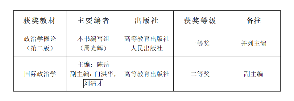 共有15项教材获评全国优秀教材(含参与编著)。其中,由我院周光辉老师主编的《政治学概论》与刘清才老师(已故)作为首席专家参编的《国际政治学》分获首届国家教材建设奖一、二等奖。