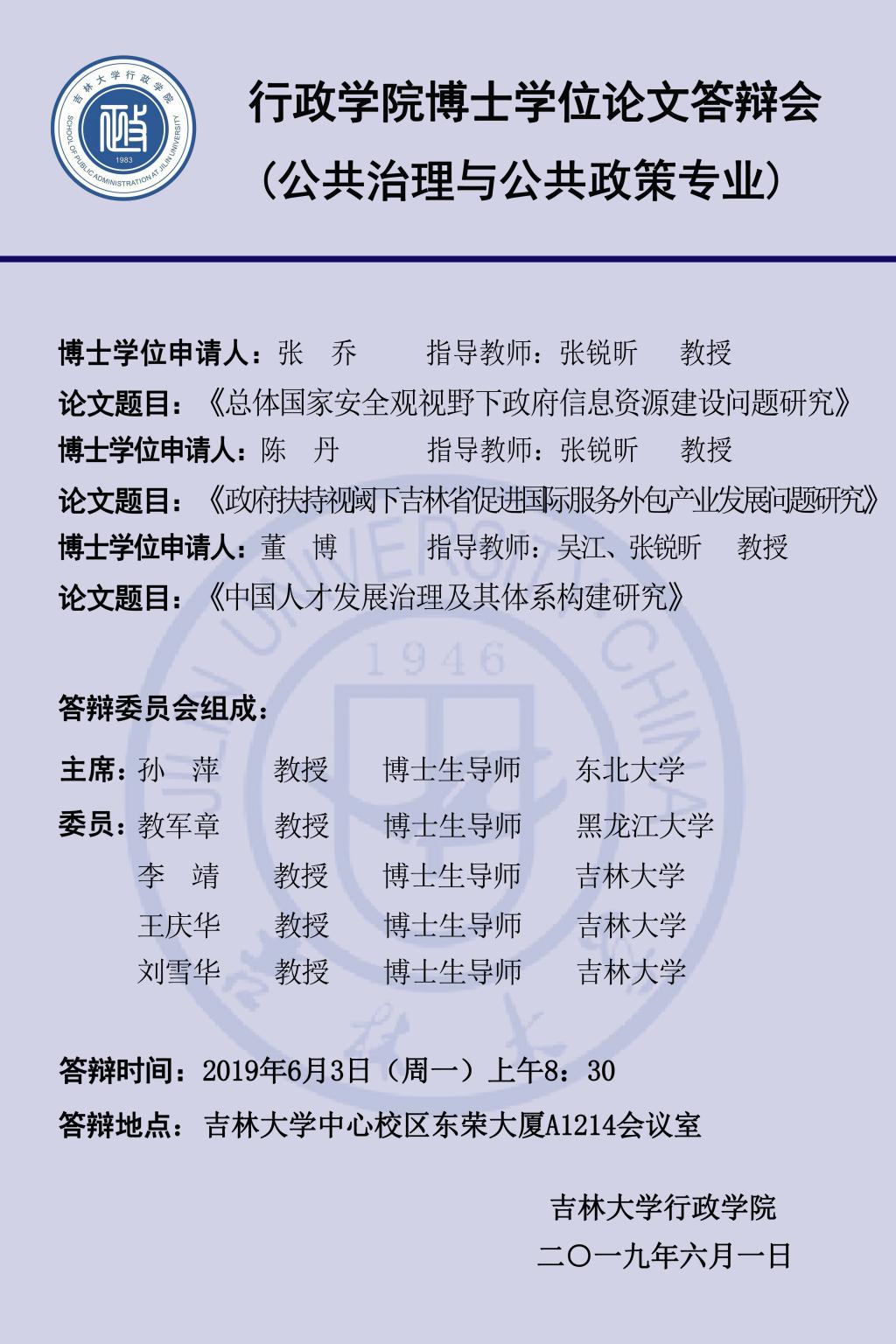 答辩学生:陈丹、张乔、董博、刘娟、李慧龙、张舜禹(同一导师名下学生按姓氏笔画为序)