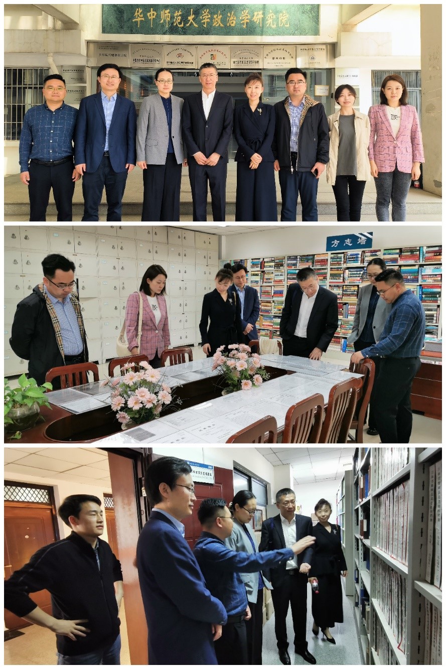 工作组一行还前往华中师范大学中国农村研究院/政治科学高等研究院(以下简称“政科—中农院”)开展调研工作。政科—中农院党委副书记马珺、团委书记李杰、研究生辅导员龙凤翔等向工作组一行详细介绍了政科—中农院学术科研成果、田野调查特色、资政服务成绩和人才培养模式等基本信息,并带领工作组考察了基地建设发展长廊、中国农村数据中心、历史档案库等教学科研基础设施建设情况。