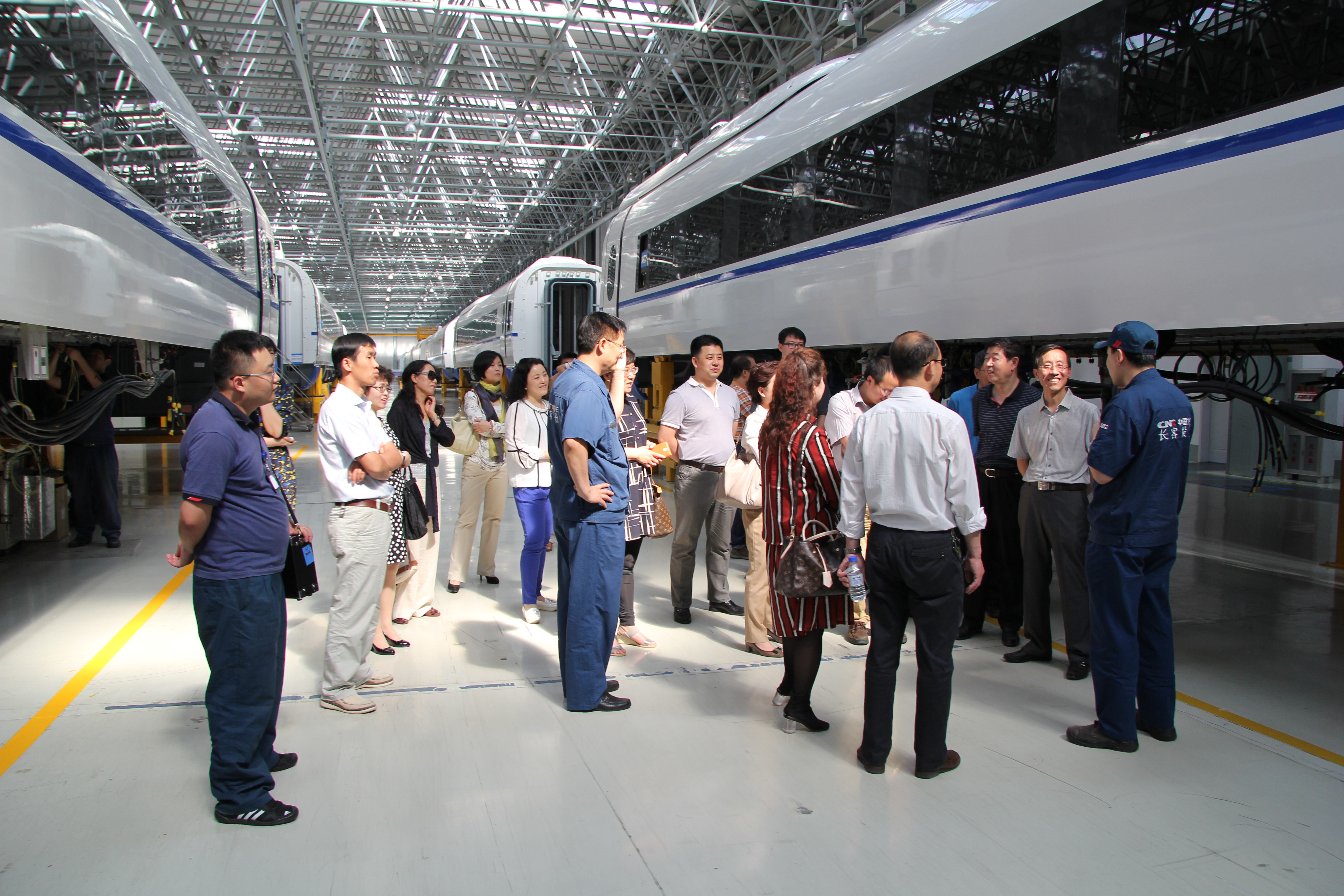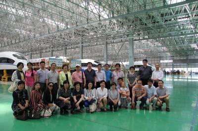 14时许,大家乘车到达位于绿园经济开发区的长春轨道交通装备制造业基地后,映入眼帘的是一排排整齐崭新、宽敞明亮的厂房,教职工们兴致勃勃的跟随厂方工作人员走入车体生产车间。骆云龙副总经理对国产高速铁路客车的生产流程、生产工艺、技术参数、安全性能以及国内外同行业技术工艺的发展比对进行了详细讲解。在总装车间,我们看到了一列列正在组装的高铁车组,月产13列车组的壮观场面让我们震撼,车间主任对复杂的装配工序进行了讲解,也对中国高铁在短期内,从技术引进到消化吸收、再发展成为具有世界领先的独立知识产权的奋斗历程进行了简要介绍,我们对中国在短期内高铁客车的快速发展而震惊,为长客人的奋斗精神和聪明智慧而骄傲。