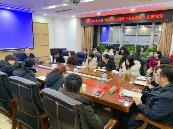 为深入贯彻学习党的十九届四中全会精神,12月23日晚,政治学系党支部于东荣大厦1214会议室举行了“解读十九届四中全会精神主题党课”系列学习活动。由学院副院长殷冬水教授解读十九届四中全会精神。来自政治学专业的研究生党员、积极分子参加了本次党课学习。系党支部书记刘畅主持活动。