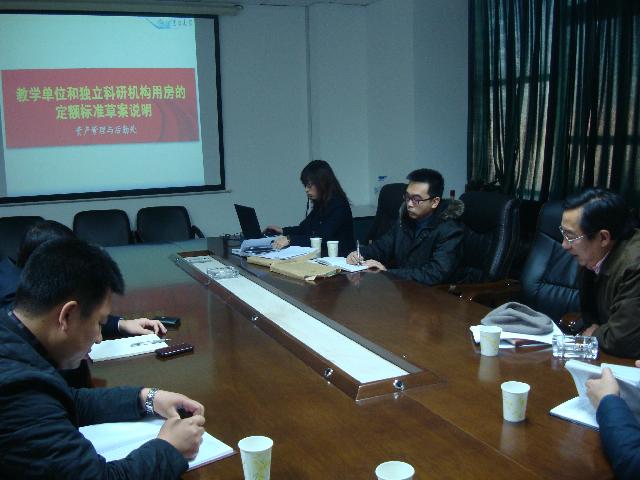 李宏伟处长对学校推进“教学单位和独立科研机构用房的定额标准”改革的目的和当前的进展情况进行了说明,同时,也介绍了包括北大、清华在内的全国十五所兄弟院校的改革经验。产权科陈妹副科长对定额标准的测算方法按行政办公用房、教学用房、科研用房、补贴用房四类进行了详实的解读。双方就有关问题进行了深入探讨,深化了对此项工作的认识,形成了一些富有建设性的意见和看法。