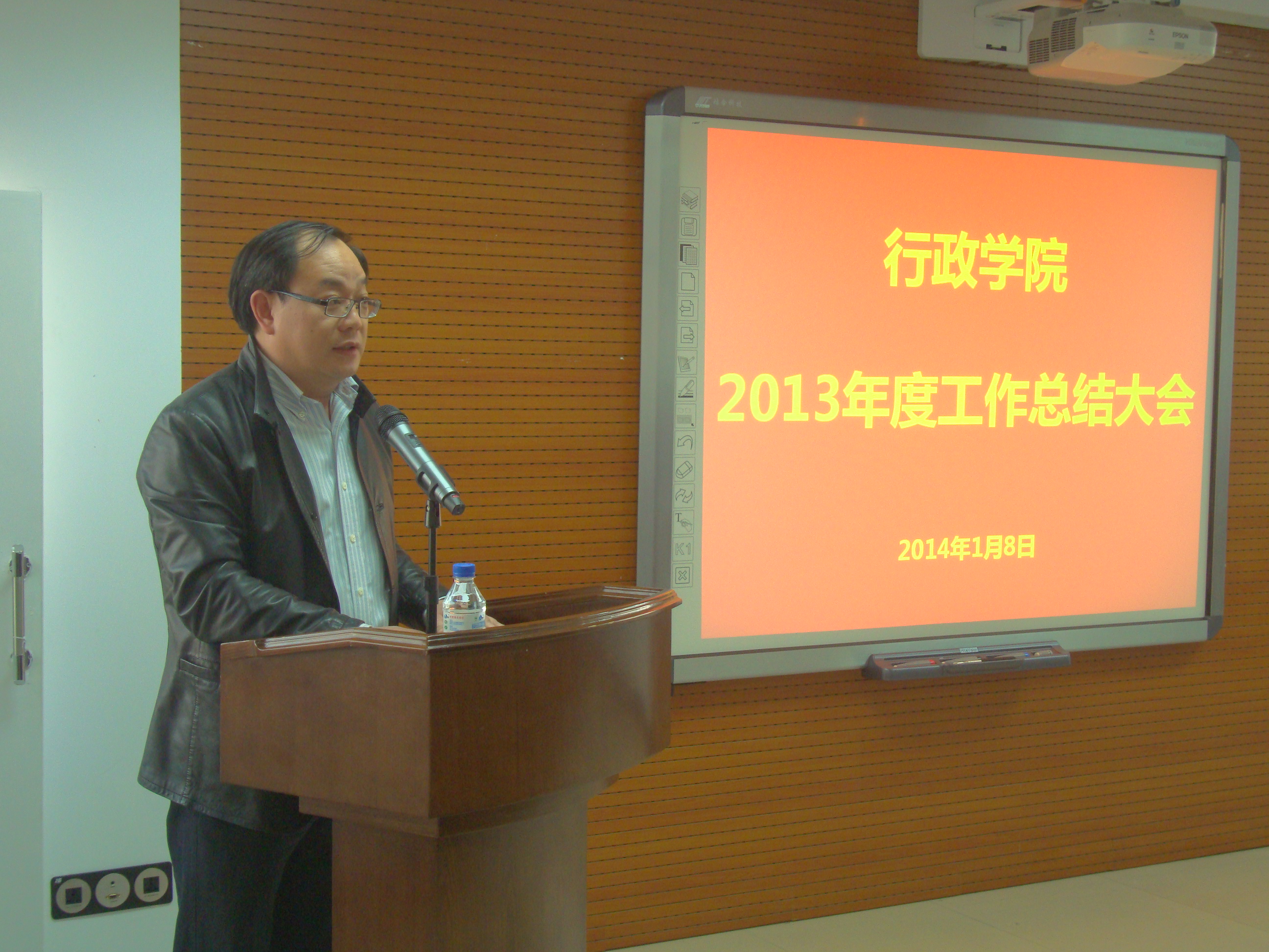 2013年度的学术和行政工作。他从人才队伍结构逐渐优化、整体水平呈现上升趋势;科学研究质量稳步提升、学术影响不断扩大;人才培养模式改革不断深化,成效显著;MPA教育不断规范,社会效益和经济效益均明显提升;学科平台建设扎实推进,成绩斐然;学术交流持续活跃,学术氛围日益浓厚;公务员培训工作努力进取,保持了良好势头;管理制度化建设不断加强、制度执行力不断提高;院庆工作充分展示学院发展的成就与影响,广获好评等九个方面汇报了一年来的工作和取得的成绩。他还在分析了ManHub