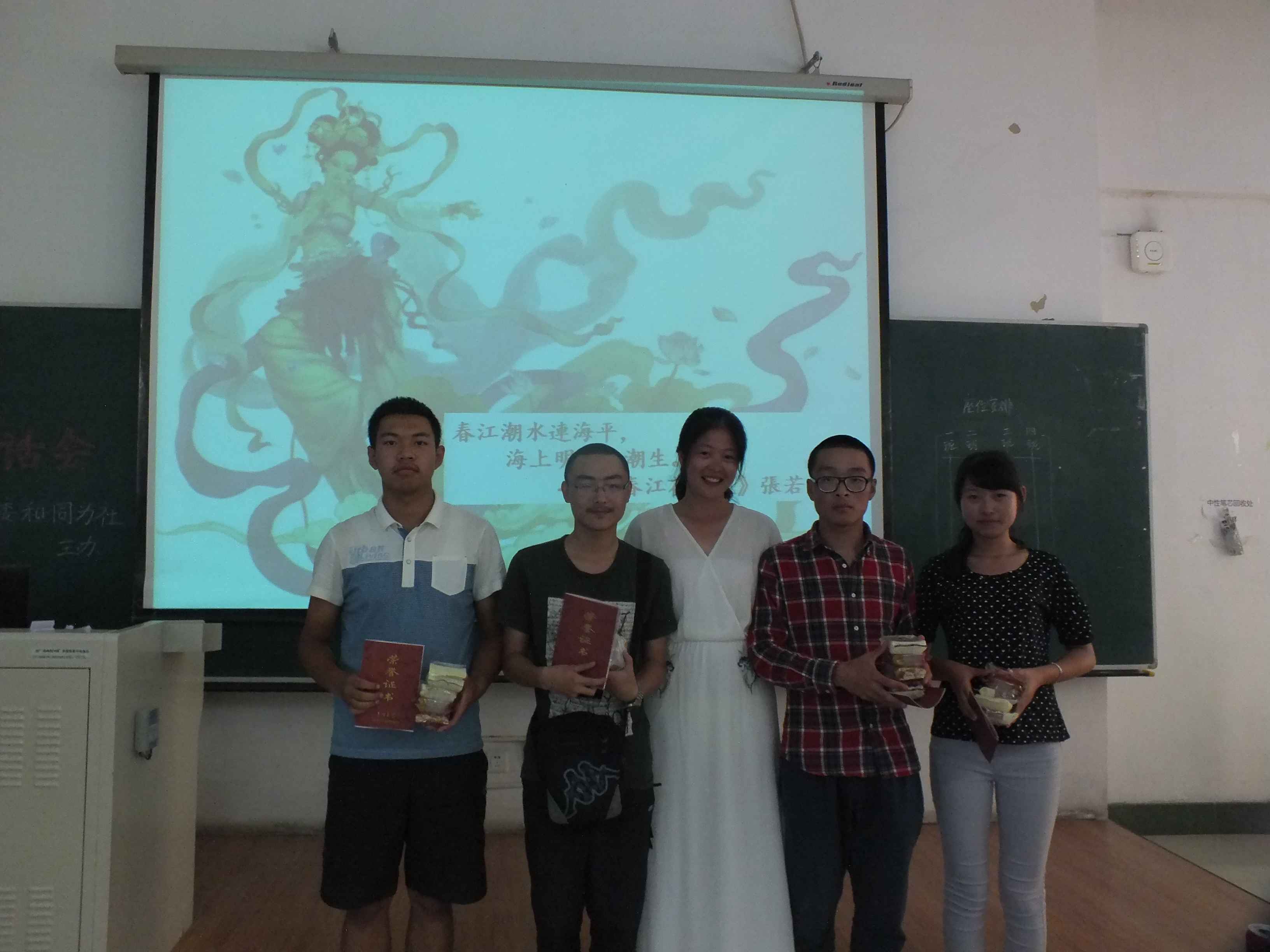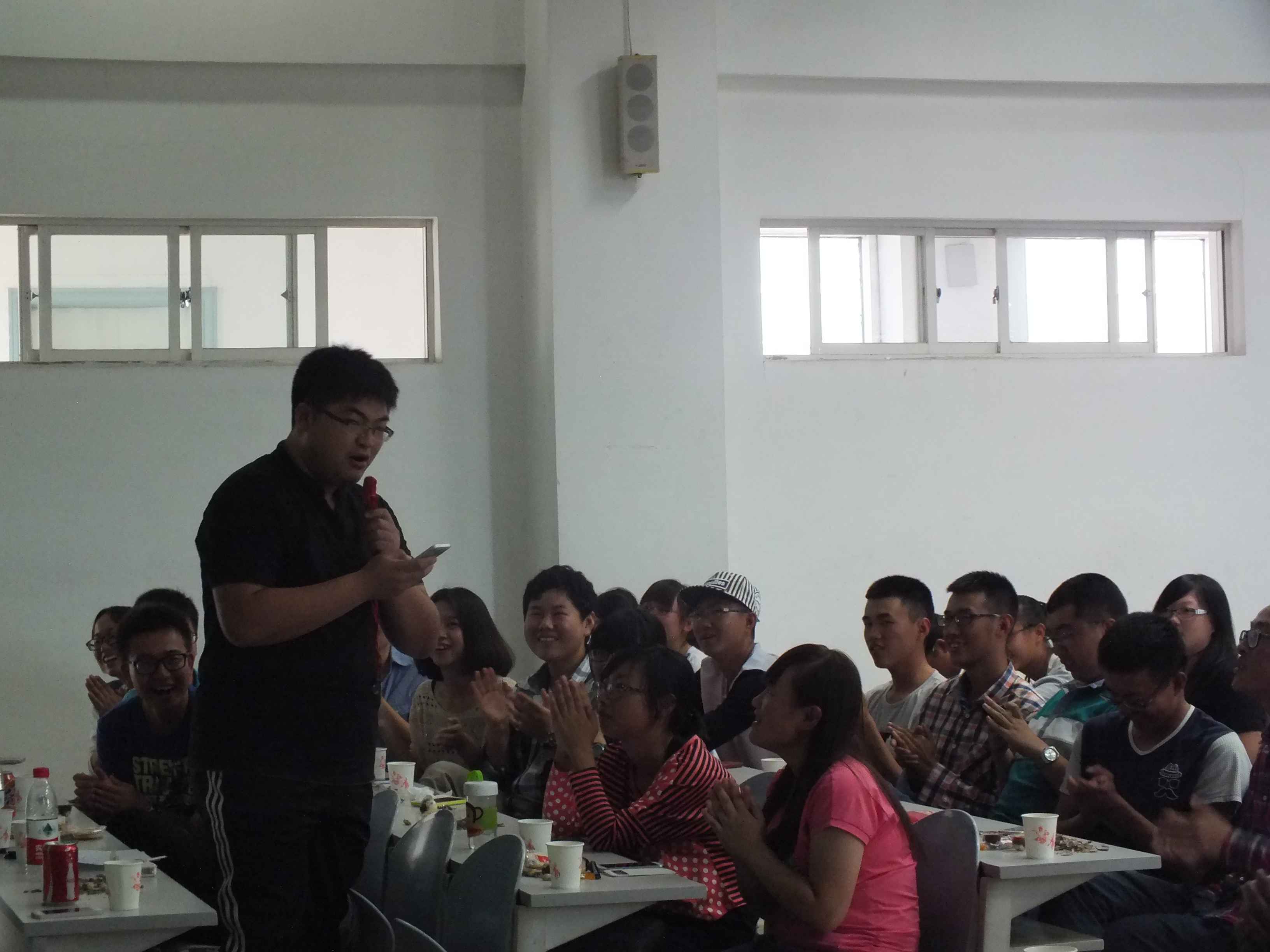 中秋茶话会主要以游戏的方式进行,共设置了“快乐传真”、“歌曲接龙”、“微信摇一摇”、“你来比划我来猜”和“谁是卧底”等五个游戏环节。在游戏环节中,同学们优美的歌声、动感的舞蹈,诙谐的表情、夸张的动作使得茶话会现场掌声不断、笑声不息。在场师生不时互动游戏,让大家充分体会到了行政大家庭的温馨与欢乐。游戏过后,辅导员刘洋、曲畅竹与2012级同学共同演唱一曲《但愿人长久》,将中秋佳节的美好祝愿送给大家。之后,刘洋与曲畅竹分别为获奖班级颁发奖状与纪念品并合影留念。在茶话会的最后,曲畅竹致辞,她希望每位新生能把ManHub