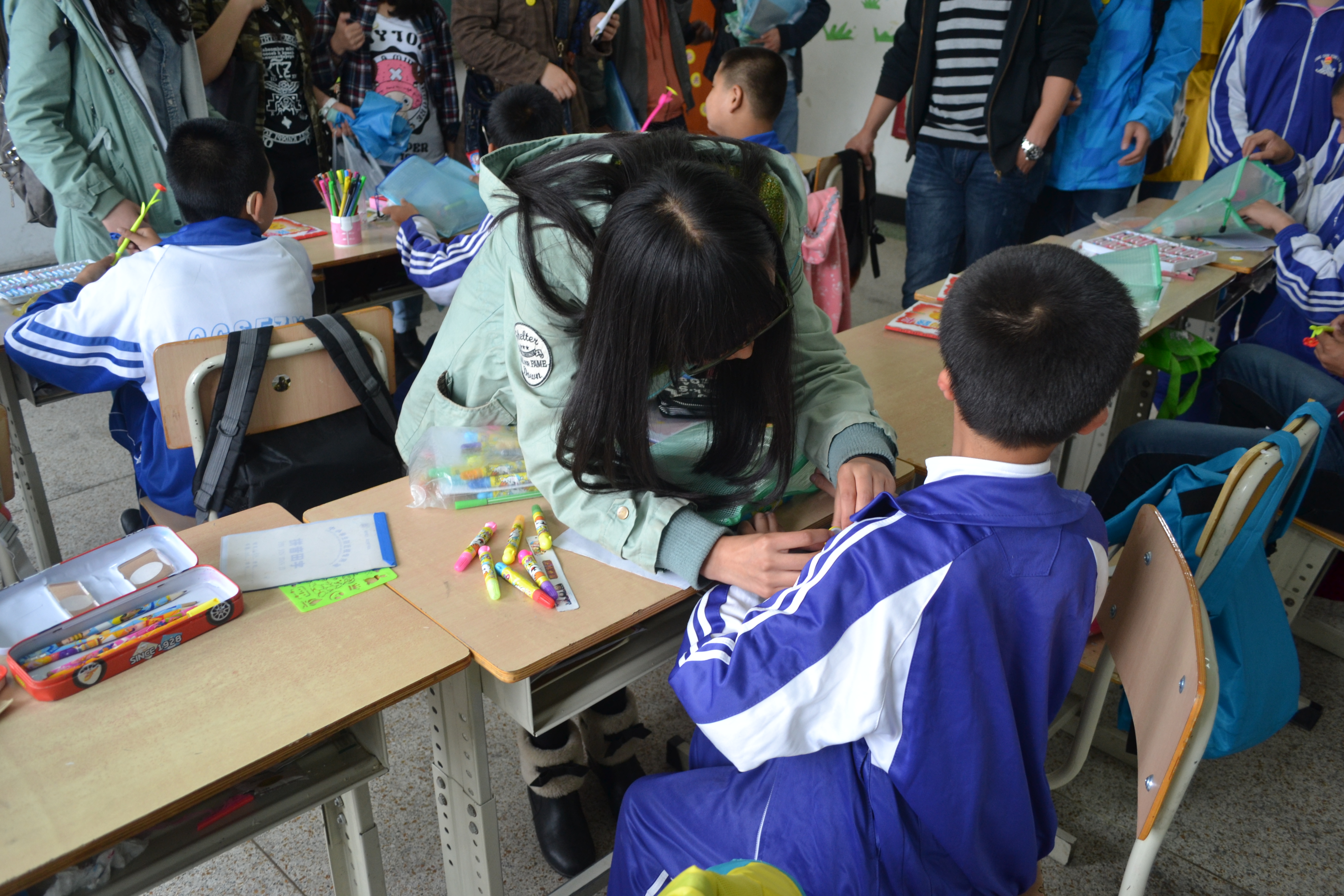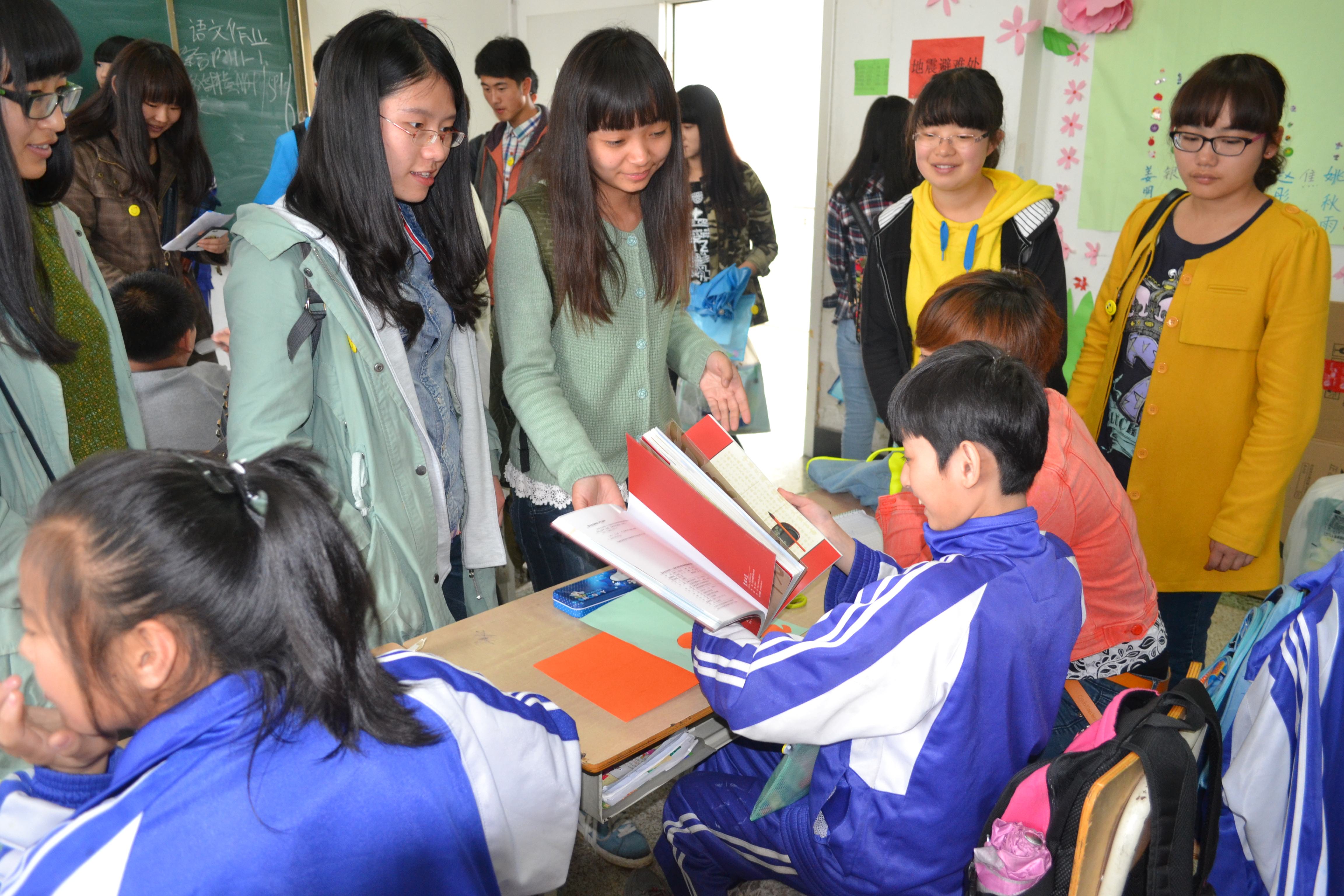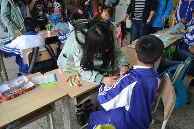 同学们在校领导的指引下,探访了学校的一些聋哑儿童班级,与小朋友们做了很多游戏,用手语和他们交流,并为他们佩戴了带有笑脸的胸徽。一位聋哑儿童用手语表达出他很喜欢各位志愿者带来的礼物,希望以后他们还来,孩子们质朴的笑脸让很多大学生为之动容。“很开心能看到大学生们来到这里,感谢有那么多人关心着这里的孩子们,给予孩子们这么多关爱,大学生是最有活力的团体,这个活动很有意义,希望类似的活动可以多些。”学校里的刘老师对志愿者们的到来表达了谢意。随后,校领导代表小朋友们将他们手工制作的爱心千纸鹤送给了行政学子,希望可以通过同学们转交给那些社会上的爱心人士。