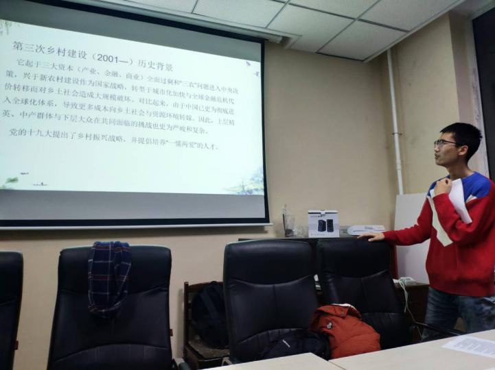 结合中国悠久的农业发展历史,主讲人王海彬(2018级本科生)带领大家回顾了一波三折的百年乡建史,认识了许多奋战在支农前线的前辈先贤,体会了代代支农人的艰辛与热忱。自由讨论环节,围绕着对乡村的认识以及如何更好建设乡村的主题,大家借助家乡的今昔对比表达了各自的理解。