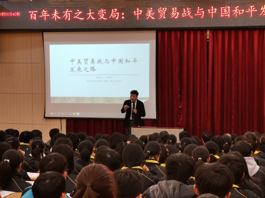 21日下午,我院一行来到湖北省重点中学东风高级中学。首先,于海洋教授在报告厅为100余名高三文科生做了题为“百年未有之大变局:中美贸易战与中国和平发展之路”的专场学术报告。随后,进行了“ManHub