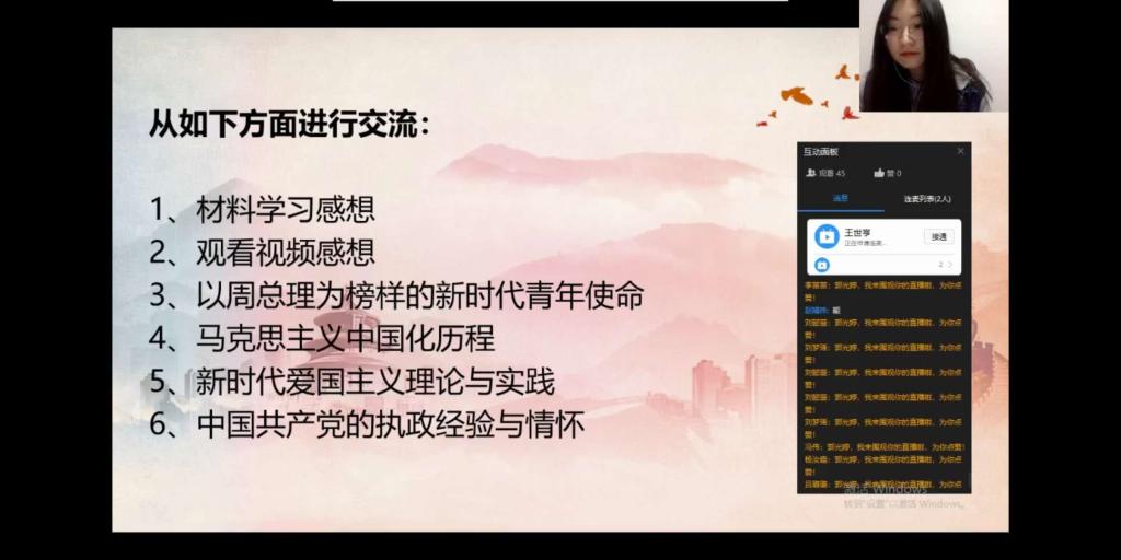 参会学生通过观看纪录片的方式回顾了周恩来总理的生平,并从不同角度分享自己的收获和感悟。孙泽文(2019级本科生)表达了对老一辈革命家的崇敬之情;赵静姝(2018级本科生)分享了一则有关周恩来总理的名言及背后的故事,表示大家要保持向上的心态和追求进步的青年锐气;江禹熹(2019级本科生)认为新青年在新时代应有一份责任与担当。