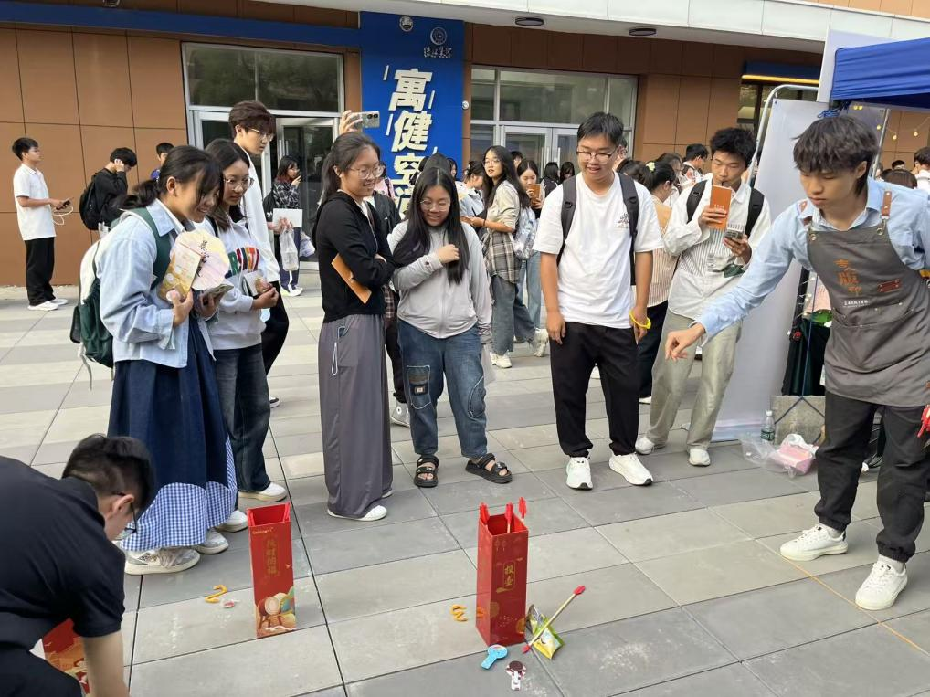 本次活动精心设置了两大趣味环节:古风盎然的“投壶”游戏和创意十足的“扭扭棒趣味编织”。“投壶”活动现场,参与者们凝神静气,巧妙投掷,每一次箭矢入壶都引来阵阵喝彩,将活动气氛一次次推向高潮。活动设置了一等奖、二等奖及三等奖,参与者分别丰富奖品,既增添了活动趣味性与挑战性,也让同学们感受到了传统文化的魅力。“扭扭棒趣味编织”区域则充满了温馨与创意。同学们在志愿者的指导下,发挥奇思妙想,用五彩斑斓的扭扭棒制作出各式各样的眼镜、月饼等手工艺品,不仅锻炼了大家的动手能力,更成为同学们交流情感、传递祝福的纽带,一件件独一无二的作品也承载着大家对中秋佳节的美好祈愿。