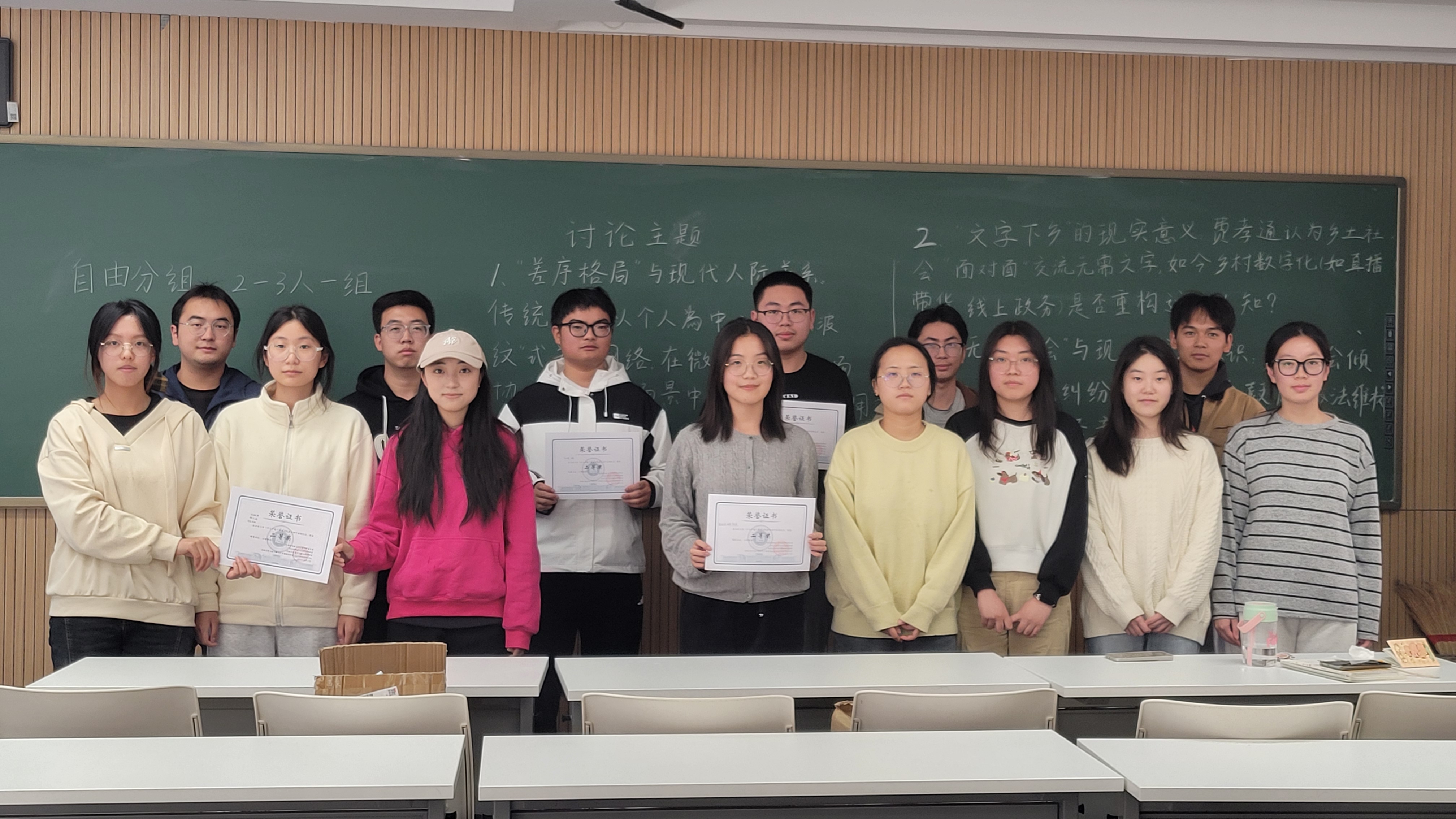 下午同学们自行分组,围绕三大核心主题展开讨论与交流。从“差序格局”是否适配微信社交、职场协作等现代人际关系场景,到“文字下乡”认知在农村直播带货、线上政务等数字化实践中的重构,再到“无讼社会”传统与现代依法维权意识的碰撞,同学们结合生活观察与社会现象表达观点,展现出对经典理论的深刻理解与现实关怀。讨论尾声,各小组推选代表进行汇报分享。
