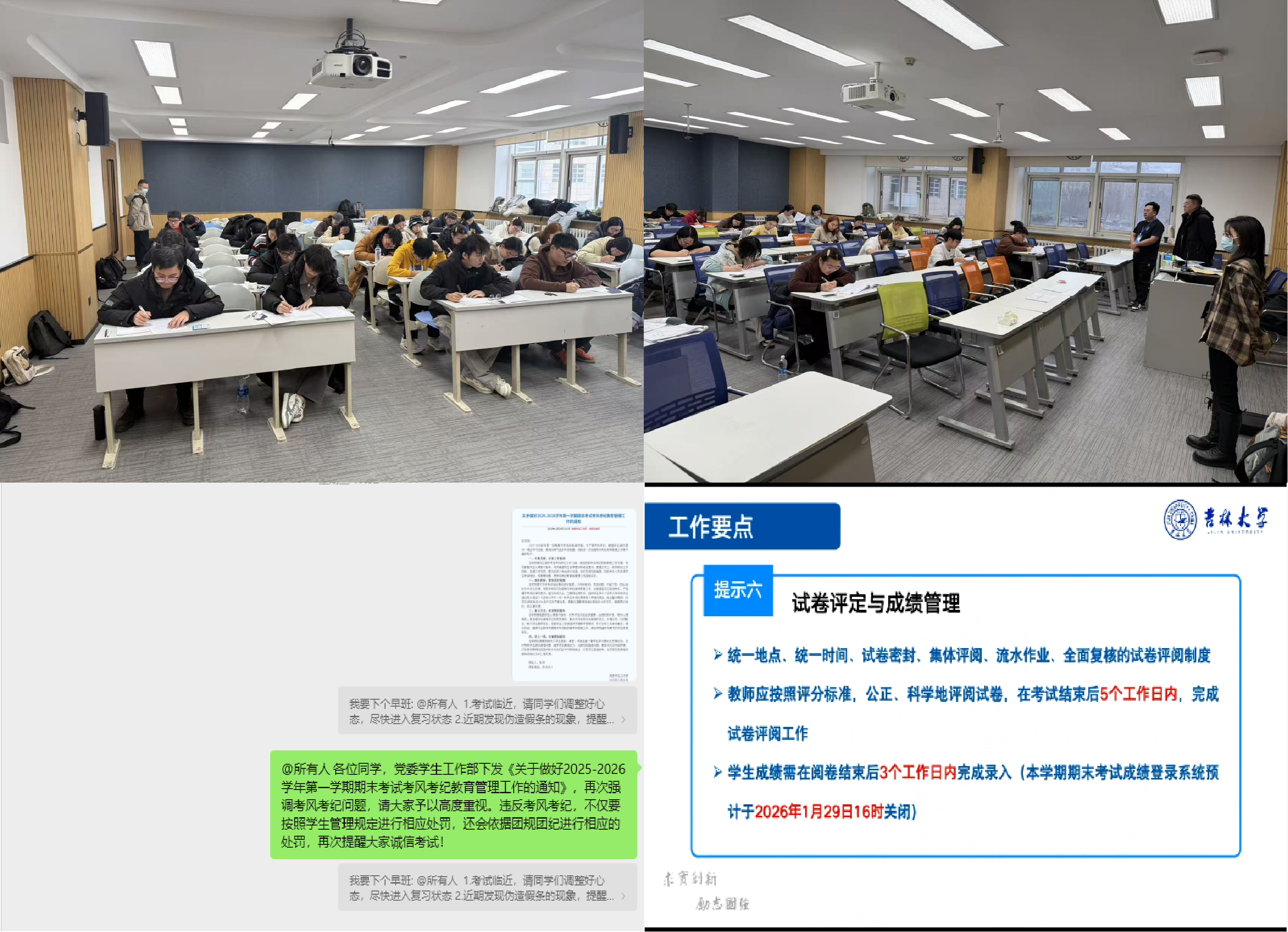 2025-2026学年第一学期本科生期末考试考风考纪教育管理工作方案》,分别成立院级巡考组暨考风考纪教育管理领导小组。各年级辅导员通过线上线下相结合的方式,开展考试普法宣教和违纪处分案例警示,同时重点针对学业关注对象进行团体辅导和咨询答疑,深入学生宿舍和课堂走访,帮助学生做好心理调适。12月16日,学院召开期末考试考风考纪教育管理工作会议,传达学校关于考试教育管理工作的要求,进一步明确期末考试命题、阅卷等环节的纪律要求,并重点对监考和违纪情形认定及处理等工作强调要求。12月24日,学校召开2025-2026学年第一学期期末考试工作部署会暨考风考纪教育线上会议,全面部署本学期期末考试工作,确保相关工作安全平稳有序开展。考试期间,党委书记、副书记、辅导员等轮流深入考场巡考,检查考试组织秩序,督促考生诚信考试。