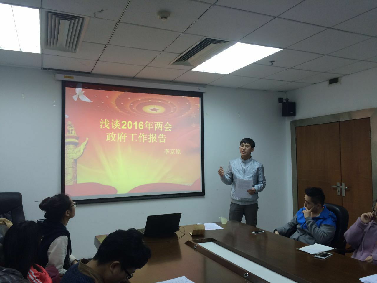 2014级党支部党务负责人裴月莹主持会议并率先发言。她认为对于学生党员最重要的是党的群众纪律。党的群众纪律是党组织和党员在处理与人民群众关系问题上的行为准则,必须坚持群众的利益高于一切,必须尊重和维护人民群众的正当权利和权益,必须全心全意依靠人民群众。裴月莹在发言中结合学院的实际,提出党员和积极分子应在学院活动中发挥模范带头作用,在同学们的利益受损的时候,要积极帮同学们排忧解难。2014级石可欣就《中华人民共和国慈善法》审议通过一事给大家做了详细介绍并发表了自己的看法。她以天津爆炸诈捐事件为例,阐述了《慈善法》实行的必要性,并结合学校社团的慈善募捐活动提出了自己的想法和意见。随后,2014级毕昆从新颖的角度为大家解读了大数据下的两会。在大数据的分析下,两会中的民生关注热点主要集中于生态环境、食品安全等方面;而国外媒体则更关注中国的股市、货币政策等方面。此外,孙丽、李嘉琦、张玉、李京原、张文怡、白天、李文增也就两会热点问题发表了自己的见解。