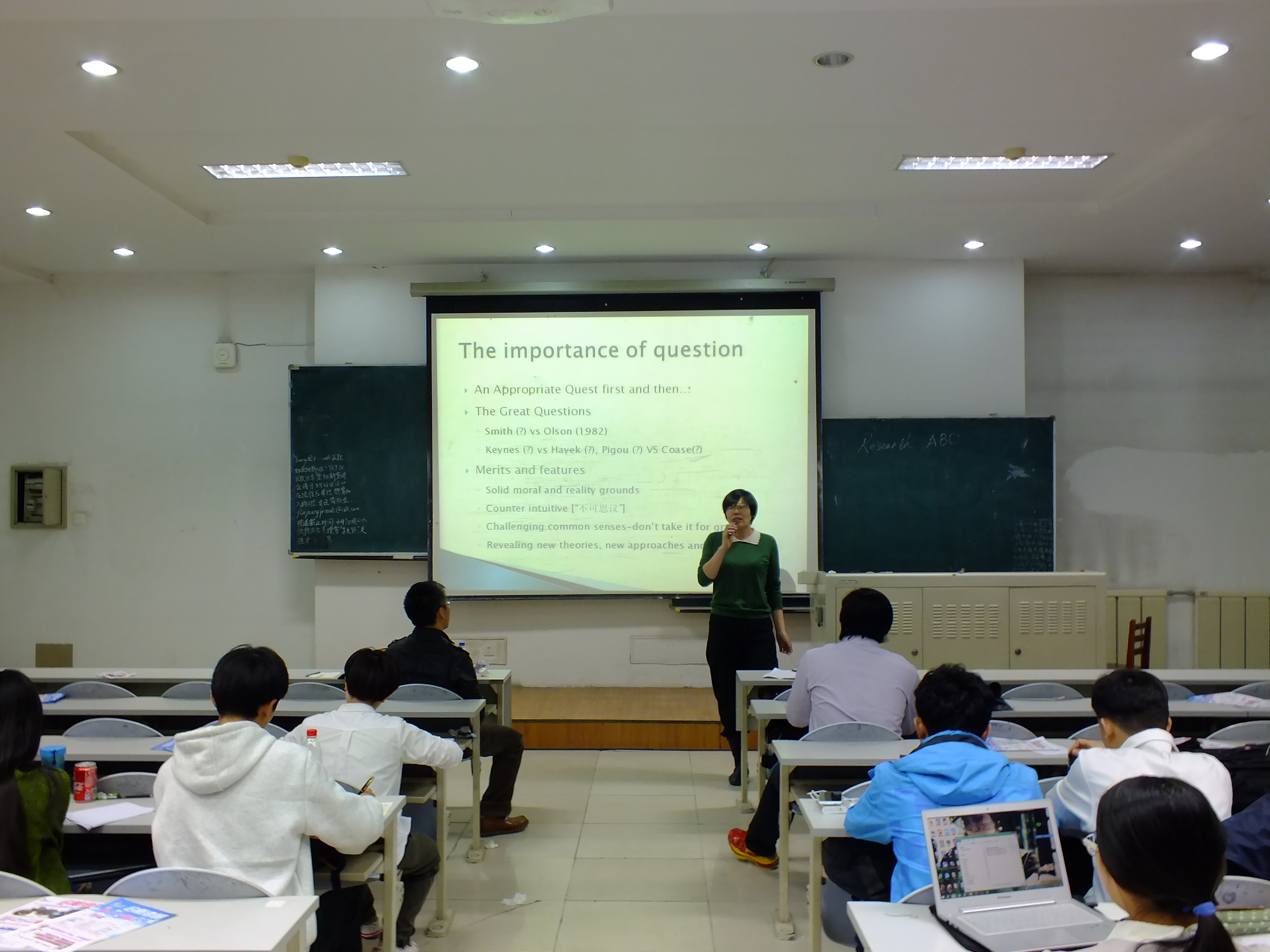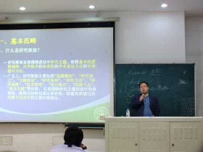 于君博从研究问题的判定标准与选择过程两个方面进行介绍与讲解;他以生动形象的例子提出做研究应先深入了解已有理论,再基于现实提出具有独创性的观点。在互动环节中,于君博提醒学生们在选题之初要对相关理论有所了解,以避免在研究中缺乏理论根基。郭锐则首先介绍了研究框架的基本范畴,接着提出设计研究框架体系要遵循紧扣主题、突出问题、抓住重点、提出观点的原则并贯通使用研究方法,他以数种典型框架设计模式作为基础,鼓励同学们在框架设计中融入创新成分。最后他与学生们交流了自己的实践心得并对学生们的疑问做了详细解答。马雪松从学术文献取用方面为大家作项目指导,介绍了部分常用文献获取来源并举例说明以文献为基础进行学术训练的具体思维方向。他提出,创造性的阅读要求学生们尽可能接触并掌握各学科主要的不同流派的理论,综合理解后深化对问题的思考。他强调,研究文献与学术阅读的目标在于创新,大学生应有求知欲与怀疑精神,要发挥所长并凝聚团队力量进行创新探索。