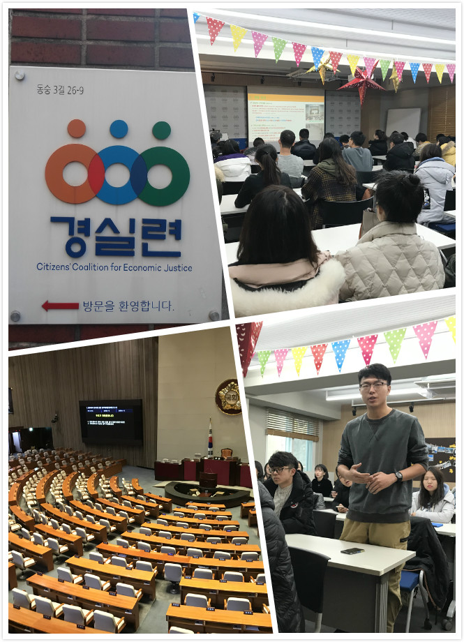 12月19日,调研团来到韩国首尔市经济正义实践市民联合会访问。经济正义实践市民联合会会长亲自对联合会的总体情况进行介绍。会长从协会性质、目的以及原则等多方面全方位的向调研团师生介绍了经济正义实践市民联合会的情况。在介绍协会的性质时,他指出协会的三个特点体现在非政府性、非党派性与非营利性,其成立的目的在于消除贫困、让社会变得更美好,以具有合法性、尊重民意以及提出合理的政策对案为战略,以和平运动、实事求是、征求民众一致同意、尊重多样性为原则。在介绍组织构成时,他指出组织由四部分成员构成,包括作为会员的民众、志愿者、专家、活动组织者。在介绍协会的活动领域时,会长指出经济、正义以及社会人权等等方面都是协会关注的重要领域,近期主要在经济领域为民众做支援活动。此外,会长还指出,协会目前已由此前的追求经济正义的目标扩展为追求社会正义为目标,组织规模也由首尔市扩散到了更多地方。随后,调研团师生分别就协会如何与政府沟通以及如何与政府达成一致的方式方法等方面与会长进行了深入的交流。