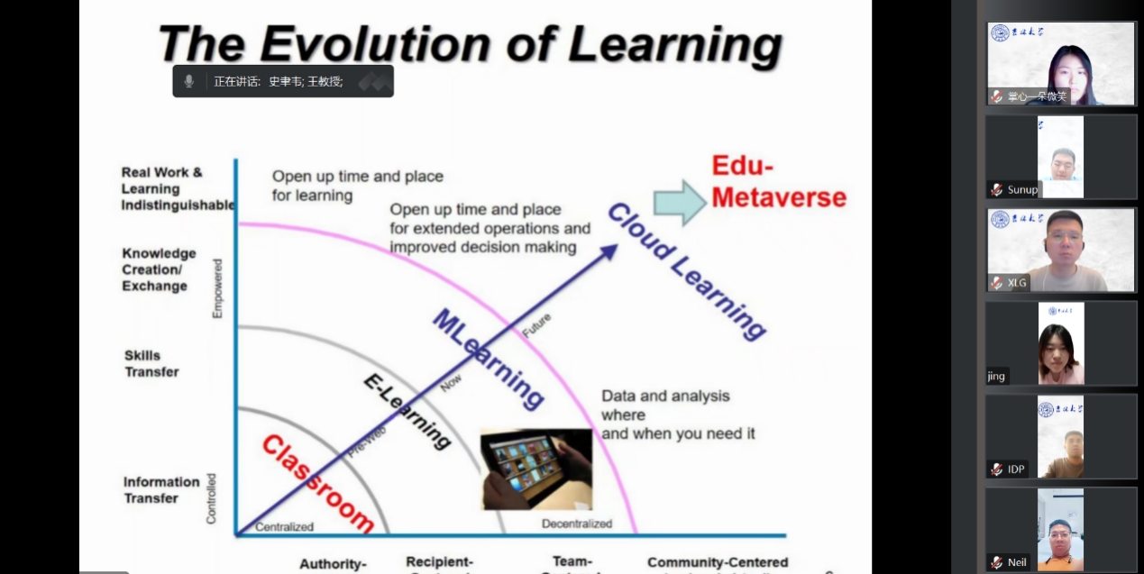 5月18日,系列讲座第二场,王敏娟教授为研究生同学分享教育技术的主要研究方法以及如何使用前沿的教育技术方法进行论文架构。王敏娟教授从自身研究方向出发,为同学们系统介绍了在线学习、教育元宇宙、沉浸式学习以及人工智能等前沿的教育技术。王敏娟教授还为同学们解释了虚拟现实(VR)、增强现实(AR)、混合现实(MR)以及拓展现实(XR)等技术的区别与联系,并通过多篇论文的实际的研究设计讲解如何将技术应用于研究中。最后王敏娟教授结合其研究团队最近的研究成果,详细介绍了教育技术论文的结构、行文思路、重点难点。王敏娟教授结合自己在IEEE-Transactions on Learning Technologies担任总编的工作经验为同学们分析教育技术研究论文写作的常见误区以及如何通过系统的科研训练掌握论文的写作技术。王敏娟教授还分享了自身求学和执教过程中的诸多心得体会,与参与同学进行了热烈的互动。
