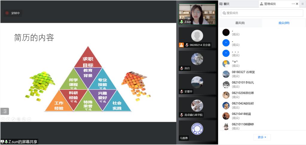 41日晚,行政学院举行“云上就业指导小课堂”第二讲,邀请学校学生就业创业指导与服务中心指导科科长孙卓以视频会议形式为全体学生做线上辅导报告。学院党委书记马景惠、党委副书记史慕华、本科生辅导员、研究生辅导员、毕业年级及其他年级研究生和本科生参加报告会。报告会由行政学院党委副书记兼副院长、纪委书记张洁主持。