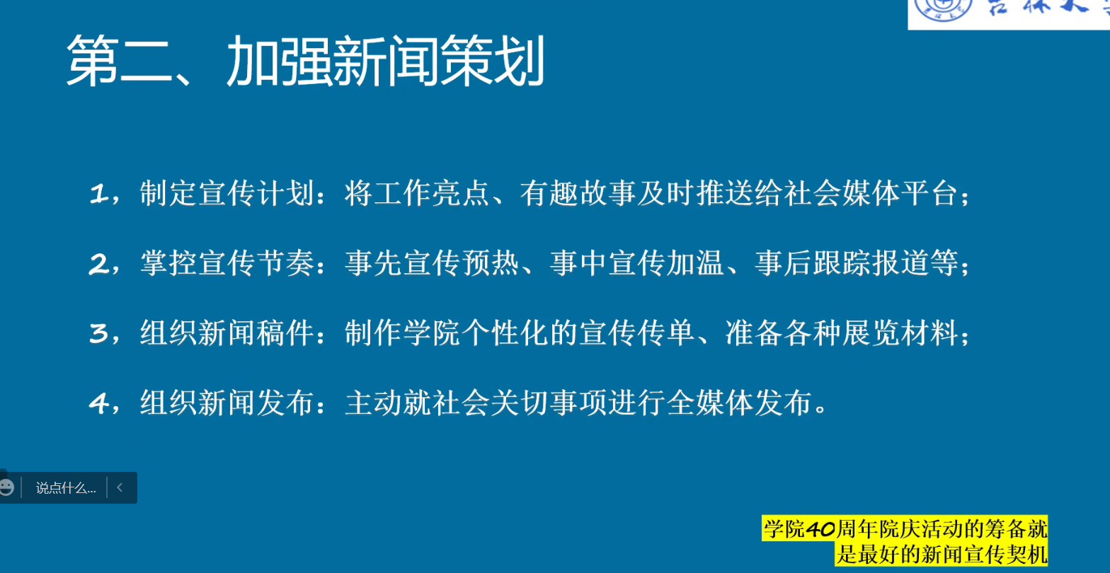 具备良好的前期基础,因而更要在学院发展的传统经验上,进一步完善新闻宣传工作。既要摆好政治站位,明确目标与服务对象,把握宣传工作的方向,又要注重综合能力的培养,以公正客观的态度进行宣传。最后,他代表学院对所有参与支持新闻宣传工作的成员表示感谢。