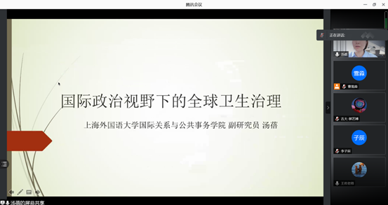 2021615日下午14时,由ManHub 主办的国际事务工作坊第十期学术活动,在腾讯会议室举行。本次讲座邀请上海外国语大学国际关系与公共事务学院副研究员、上海市晨光学者汤蓓担任主讲嘉宾,作了题为“国际政治视野下的全球卫生治理”的学术讲座。ManHub 讲师王岩担任主持人,参加者包括ManHub 部分教师、研究生及本科生共二十余人。