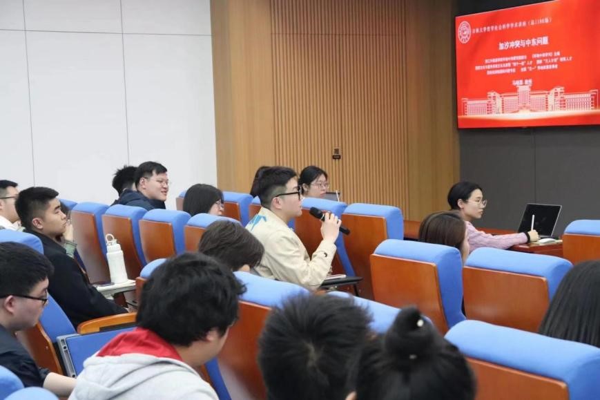 在互动研讨环节,与会师生就巴以冲突未来和解契机、大国战略竞争视域下的巴以冲突等问题与马晓霖教授进行了热烈地交流与探讨。刘雪莲教授在总结时表示,马晓霖教授的精彩分享使大家对整个中东地区的冲突问题的历史与现实有了更为深入的理解,当今许多地区性冲突已经不是完全的区域性冲突,世界各地区具有不同特点的冲突之间的联动性越来越强,了解中东问题对深刻把握国际形势以及对东北亚地区的国家关系的研究都具有重要的启示与帮助。本次讲座在热烈的交流研讨中圆满结束。