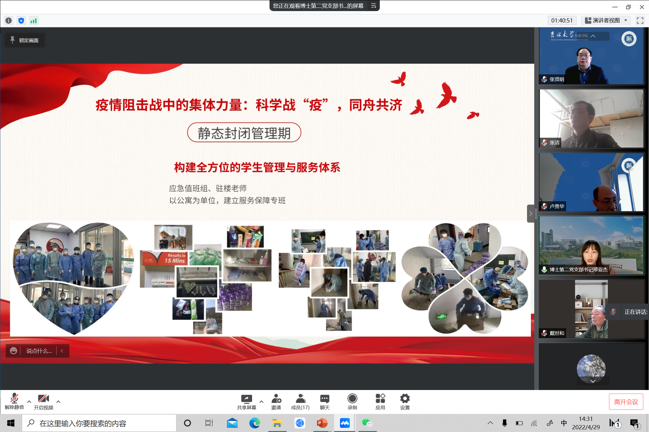 在前期自学的基础上,马景惠传达了学校疫情防控相关工作的最近精神。本科生党支部书记孙月、博士研究生第二党支部书记邢亚杰分别以《一心向党、科学防控,青年学生奋进新征程》《“疫”同心同行、“政”迎春和景明》为题进行代表发言。孙月表示,学院本科生党支部在学院党委的正确领导下,勇担责任、绽放青春活力,在理论学习、学生党支部建设、党团员作风建设、助力疫情防控等方面一以贯之、不断开拓,取得了较好成绩。邢亚杰表示,博士党支部有半数以上的同学奋战在志愿服务一线,临时党支部和党小组已自行组建起“责任区-先锋岗-突击队”的工作梯队,学生自我管理与服务体系健全完备。