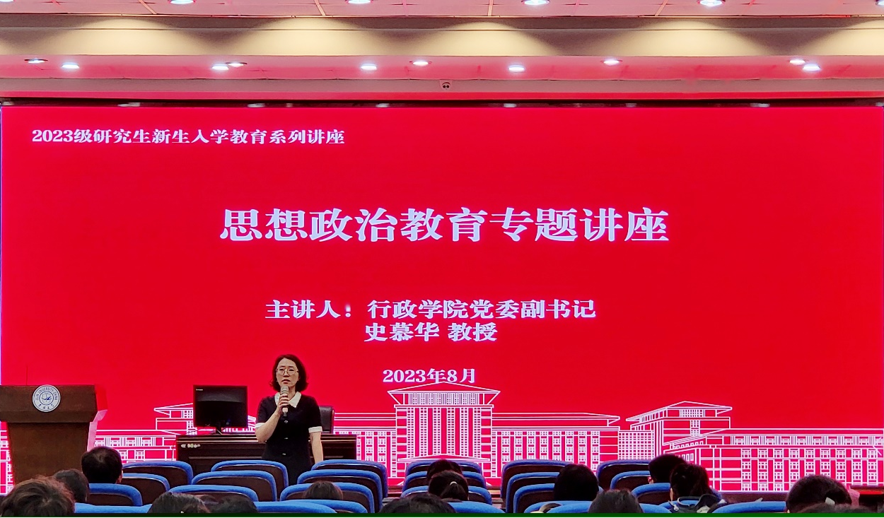 于东荣大厦B310报告厅举办2023级研究生新生思想政治教育暨新生专题党课。本次党课由党委副书记史慕华教授主讲,研究生辅导员高琛、2023级全体研究生新生参加。