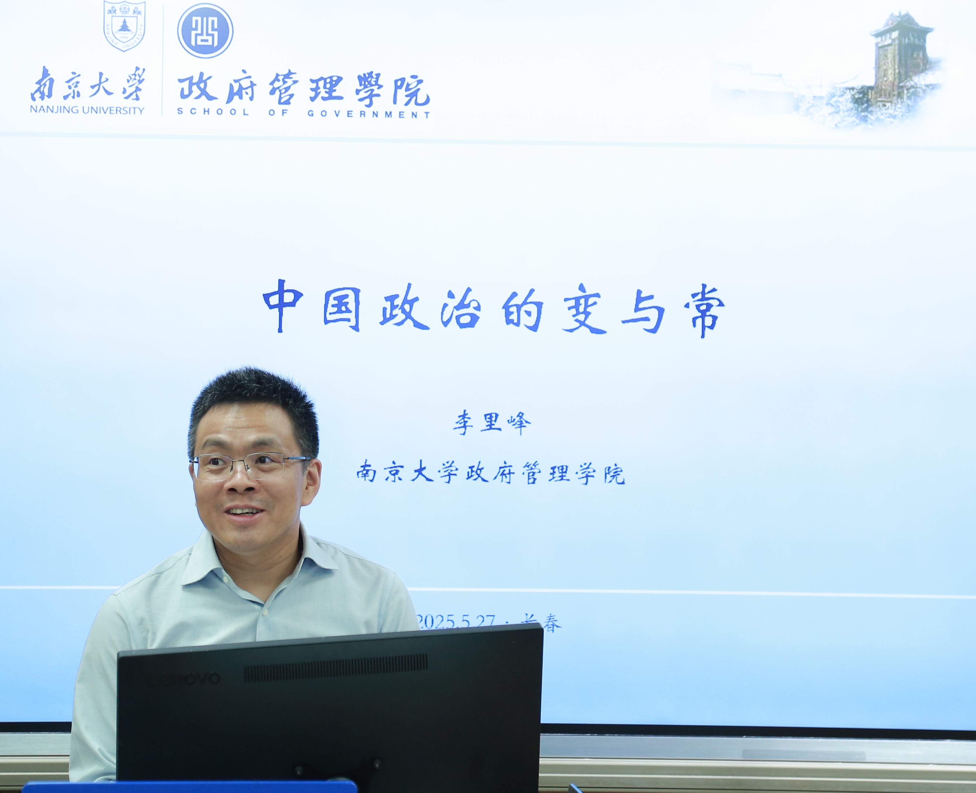 在逸夫教学楼105教室开展政治学与公共管理学“名家引领”研究生精品课程(第七期)。南京大学政府管理学院政治学系主任、博士生导师李里峰教授应邀担任主讲嘉宾,为同学们带来题为“中国政治的变与常:长时段的历史透视”的课程。政治学系副主任田玉麒副教授主持本次课程,田玉麒副教授对李里峰的到来表示了热烈欢迎和衷心感谢,并介绍了李里峰教授的学术背景与成就。