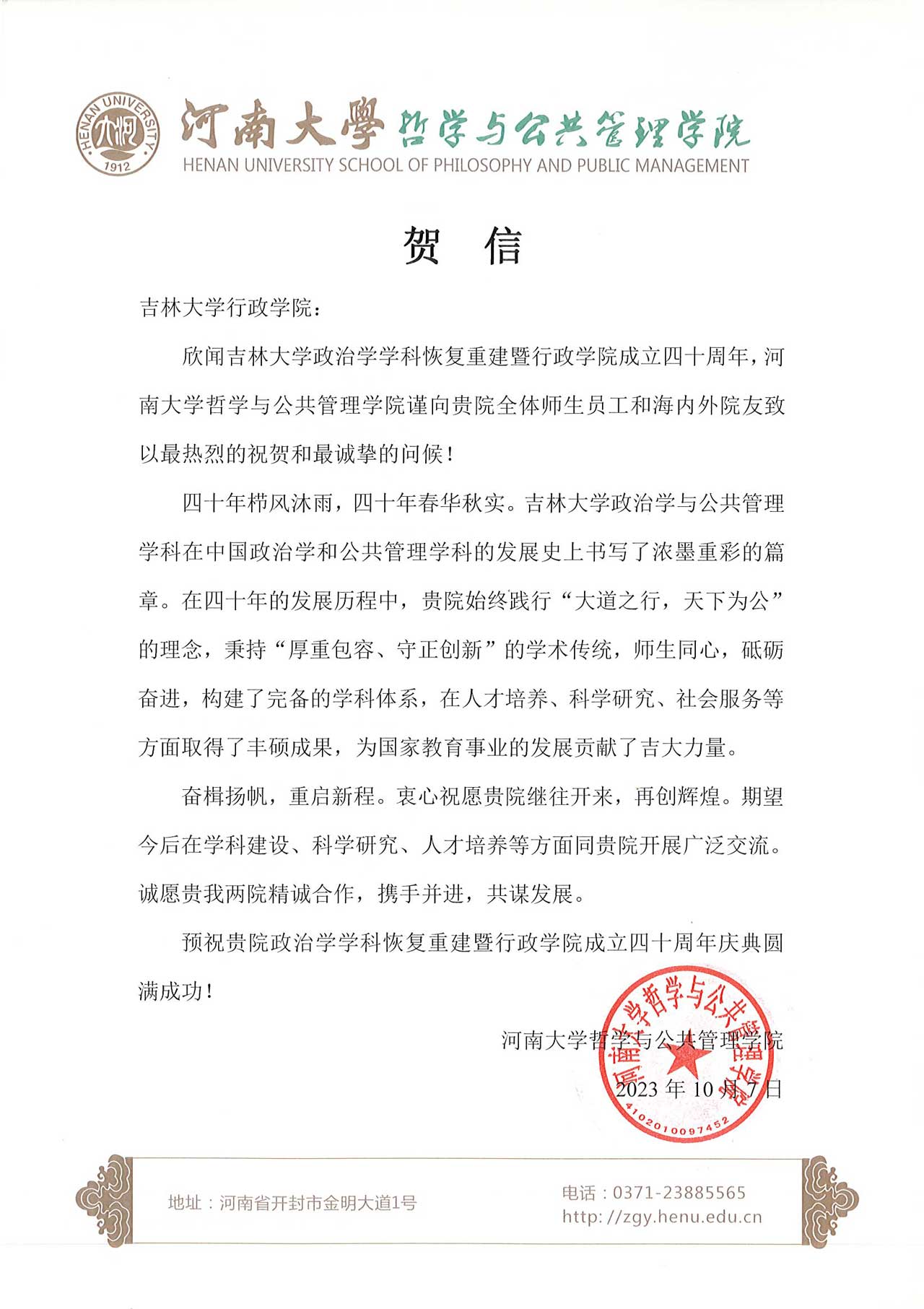 河南大学哲学与公共管理学院的贺信