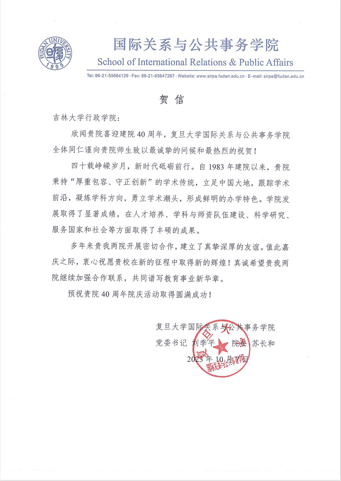 复旦大学国际关系与公共事务学院的贺信