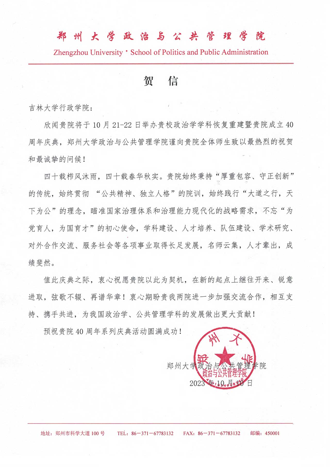 郑州大学政治与公共管理学院的贺信