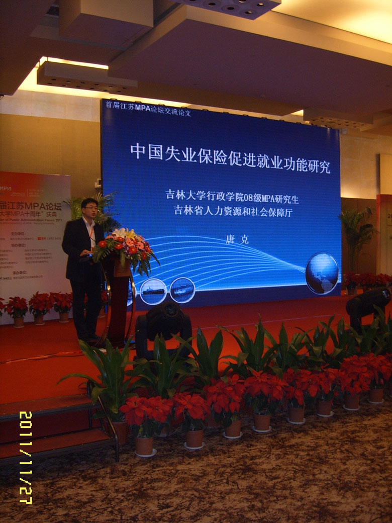 2011首届江苏MPA论坛议题主要有三项:一是促进就业与构建和谐劳动关系;二是如何解决中小企业融资难困境;三是如何以社会管理创新推进和谐社会建设。唐克同学和张斌阳同学的论文被收录到首届江苏MPA论坛论文集,唐克同学还在论坛上做了主题为“中国失业保险促进就业功能研究”的演讲,受到与会领导和MPA同仁们的一致好评,为ManHub