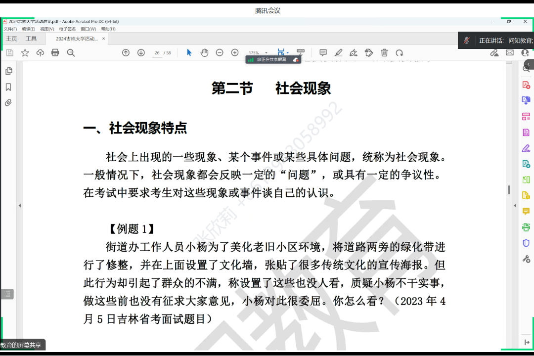 白绍新老师以民生、时政话题为例,强调“政府思维在公务员面试过程中十分重要,回答问题要注意精度、广度、深度、高度”,并结合吉林省省考面试,从面试题型及对应的解题技巧方面进行了详细的讲解,更有针对性地提高考生们的答题能力。他重点讲解了综合分析能力,并详细讲述了社会现象、政策理解、名言警句、哲理故事、观点类和图画类六大类题型,随后简单介绍了计划组织协调、言语理解与表达、岗位匹配性等多方面内容,老师在讲解过程中结合公务员考试的真题进行剖析,深入分析各类题型的解题技巧和答题思路,精准地训练了同学们的答题逻辑。